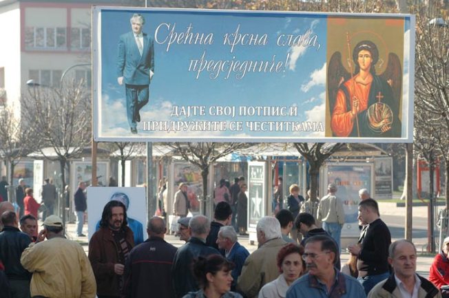 Na plakatima stoji: ''Recimo svi zajedno: predsjedniče, sretna ti krsna slava'', kao i lik arhangela Mihaila i kroki Radovana Karadžića.